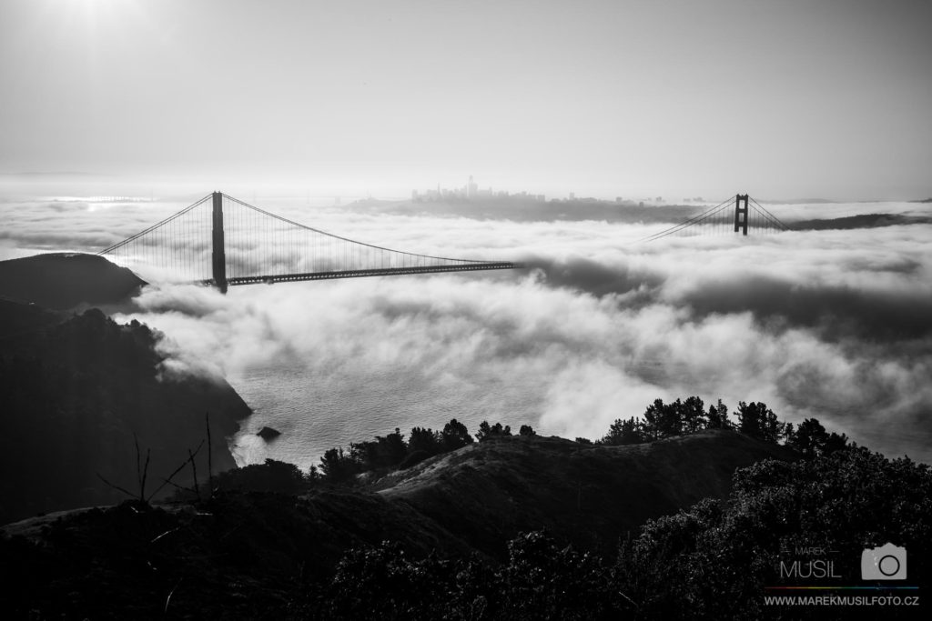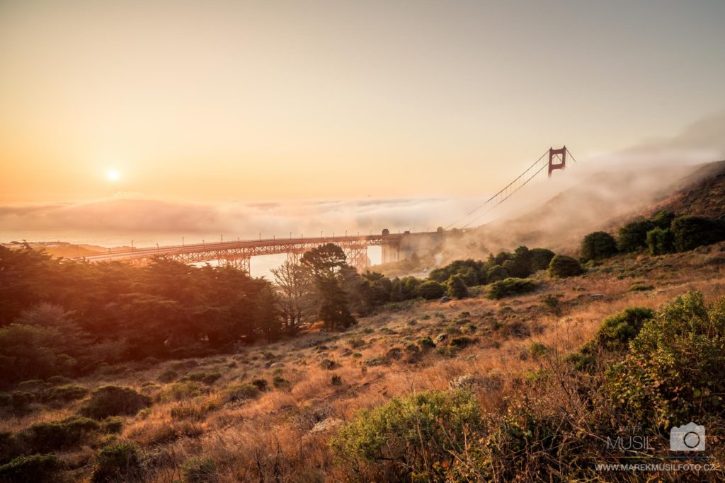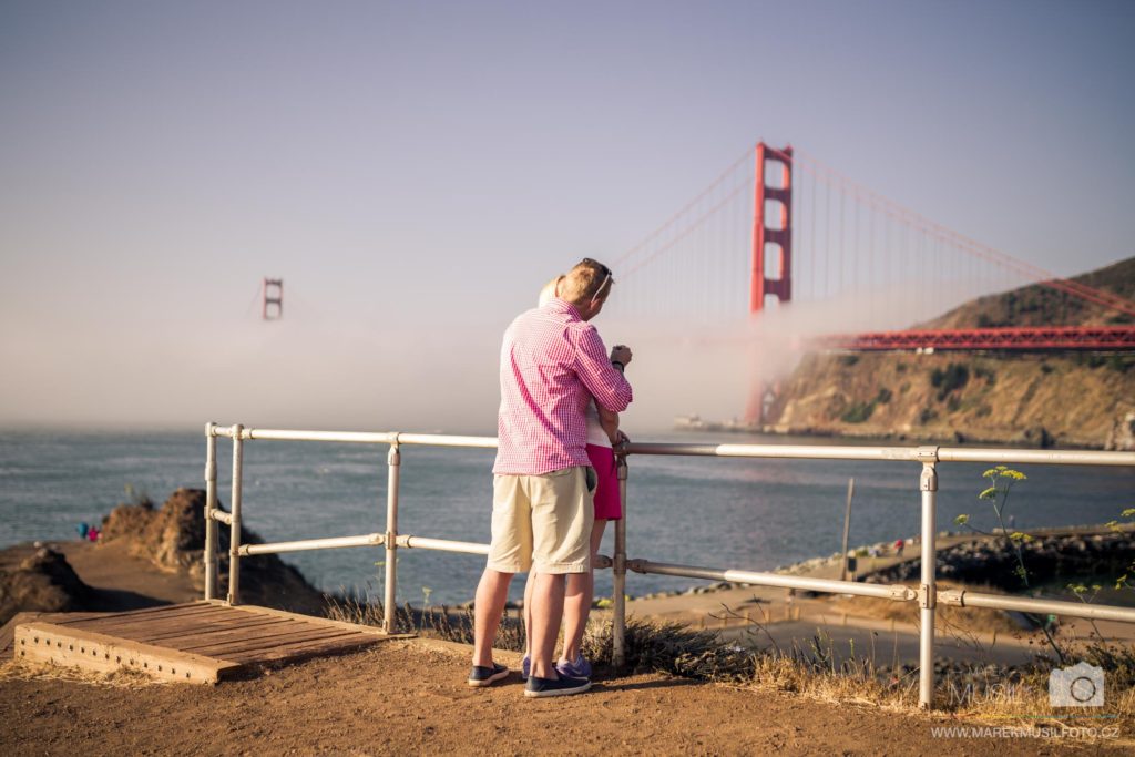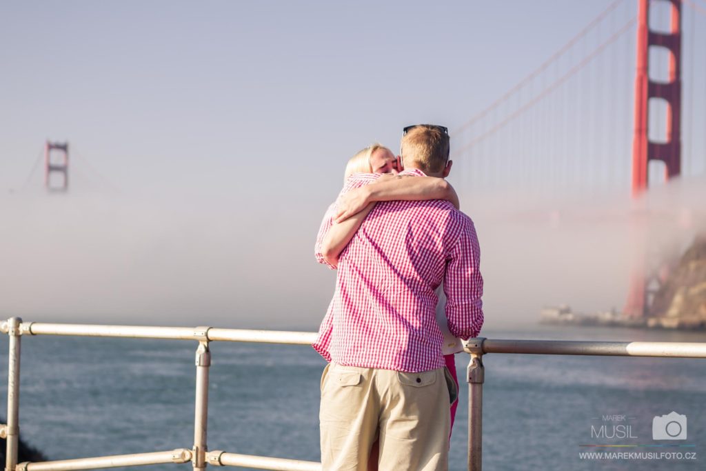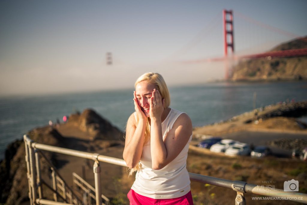 Další den jsme vstávali kolem čtvrté, abychom se dostali na východ slunce opět k mostu a mohli udělat úspěšnější reprízu předchozího dne se vším všudy. Moje tajná motivace nebyla ani tak focení, jako spíš plán požádat Melindu u Golden Gate Bridge o ruku (plánoval jsem to už někdy od března). Vyhlídka Battery Spencer byla opět celá v mlze, ale všude jinde panovalo krásné počasí. Fotil jsem jenom tak naoko, ale ve skutečnosti jsem spřádal tajné plány, kde onu věc udělám. Tahal jsem nenasnídanou Melindu ze všech stran kolem mostu, což už je samo o sobě obrovskej risk, ale pořád jsem nemohl najít místo, kde by každou chvilku nechodili lidi. Takový místo se podařilo najít až cca o půl desáté, takže jsem se do toho směle pustil vědom si, že pokud odmítne, zlikviduje to celou dovolenou.