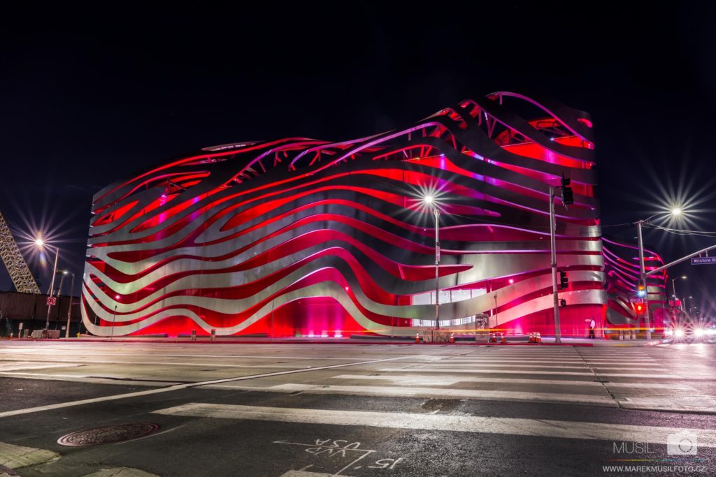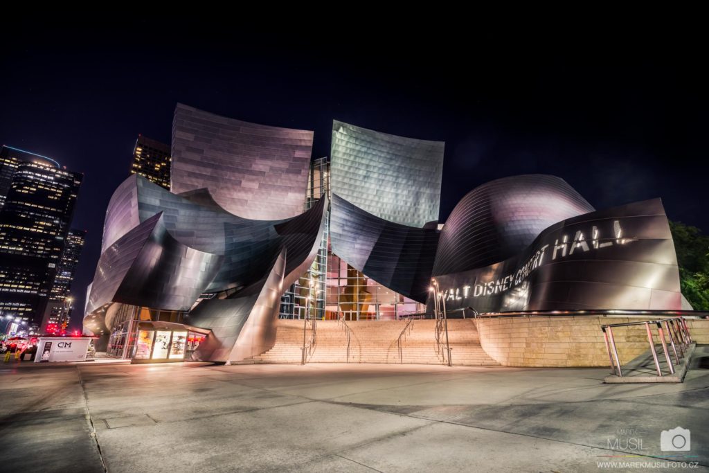 Večer jsme ještě měli v plánu kouknout na světla u muzea LACMA, ale nějakým nedopatřením (posral jsem to při zadávání do GPS) jsme se objevili u Walt Disney Concert Hall. To je architektonický skvost od Franka Gehryho v takové ceně, že by i Donald Trump počkal do výplaty.