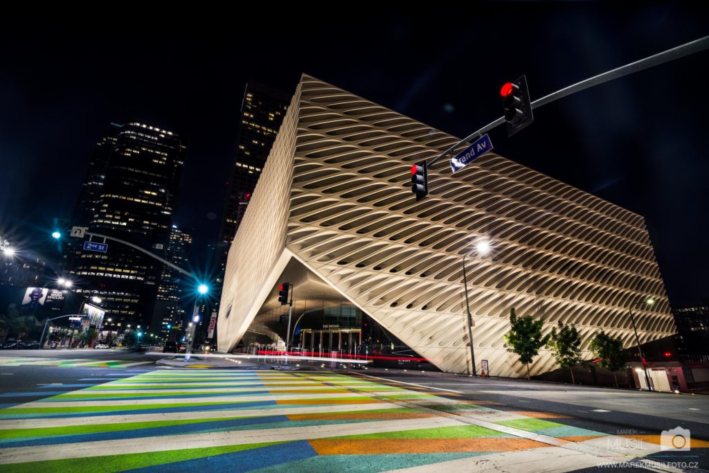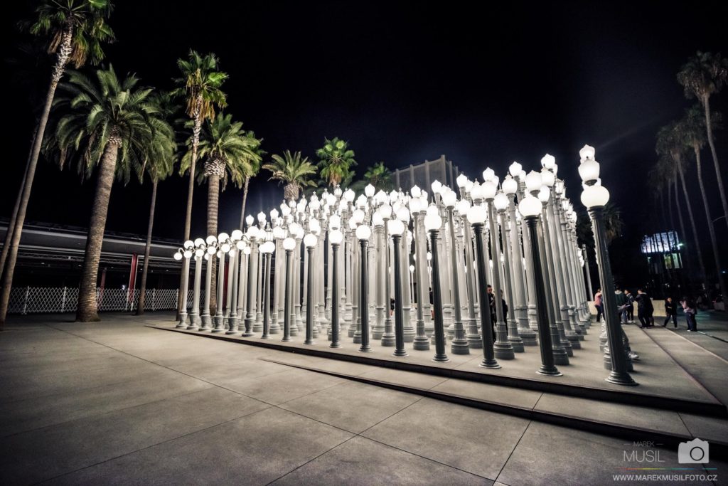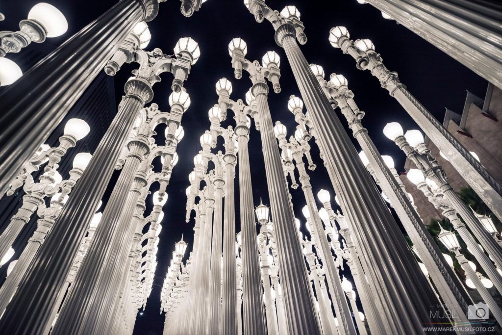 Hned vedle je muzeu moderního umění The Broad (budova s opakujícím se vzorem na fasádě a jedním oknem) a pak už jsme vyrazili do LACMA, kde je slavné sloupořadí lamp z Los Angeles.