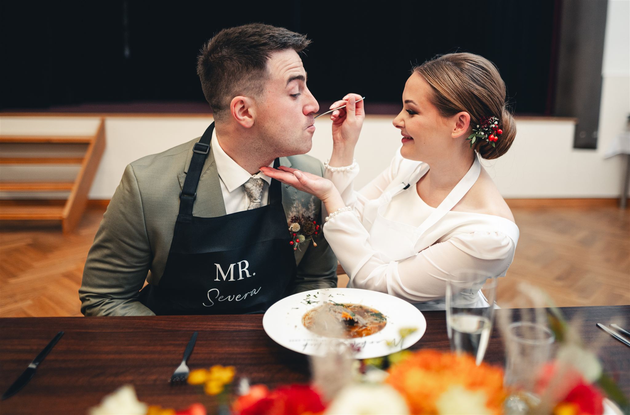 Máte společnou polévku? Pokud chcete mít z tohoto momentu co nejlepší fotky, uspořádejte stoly tak, aby přímo naproti vám byl prostor. Pokud to ale vaše svatební místo neumožňuje, nedělejte si s tím starosti – fotografové si s tím nějak poradí.