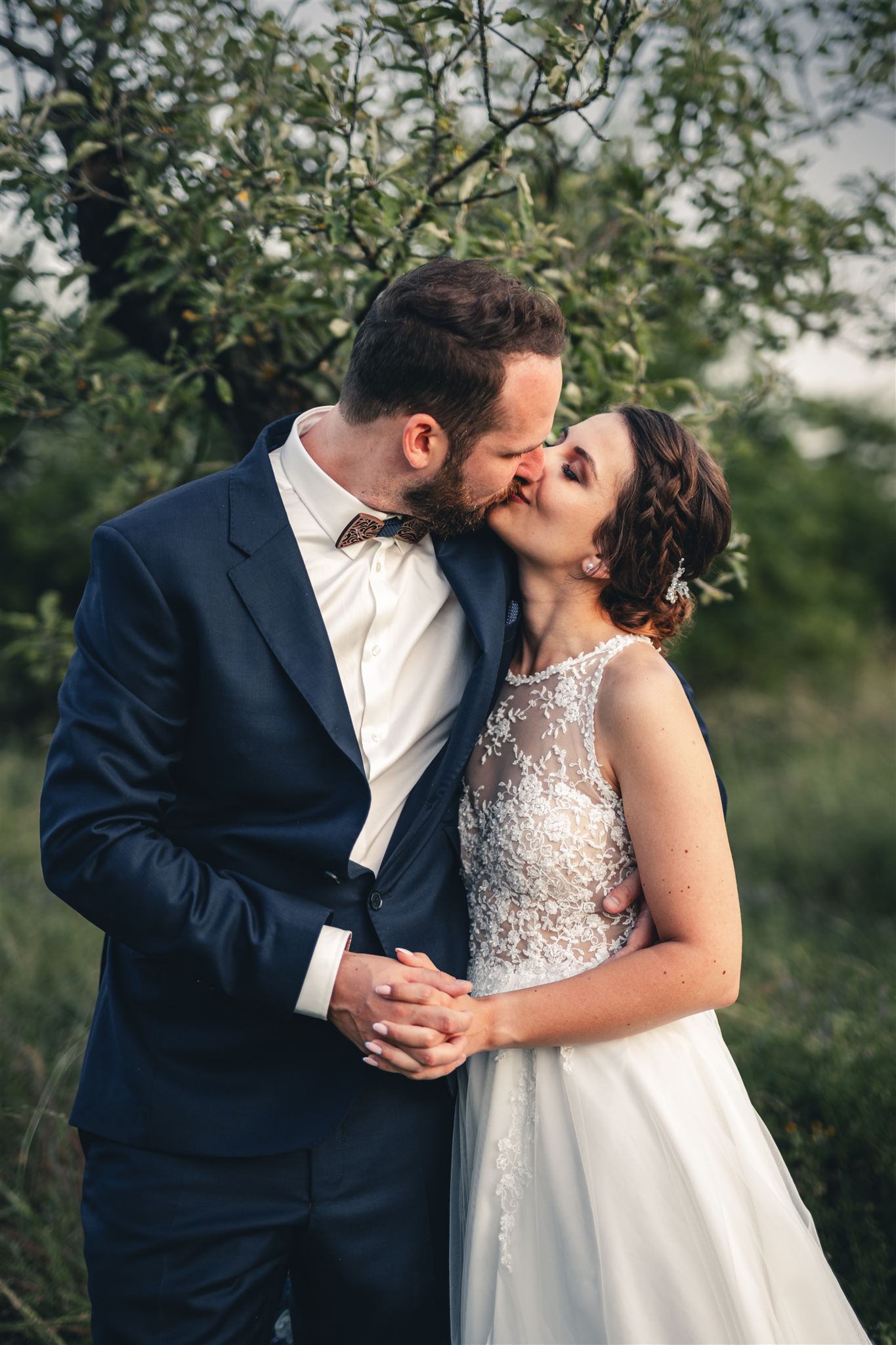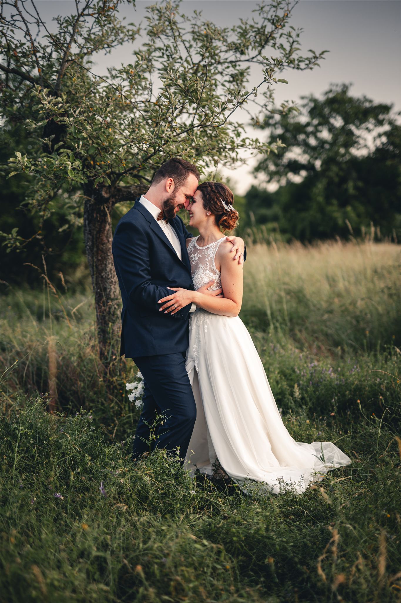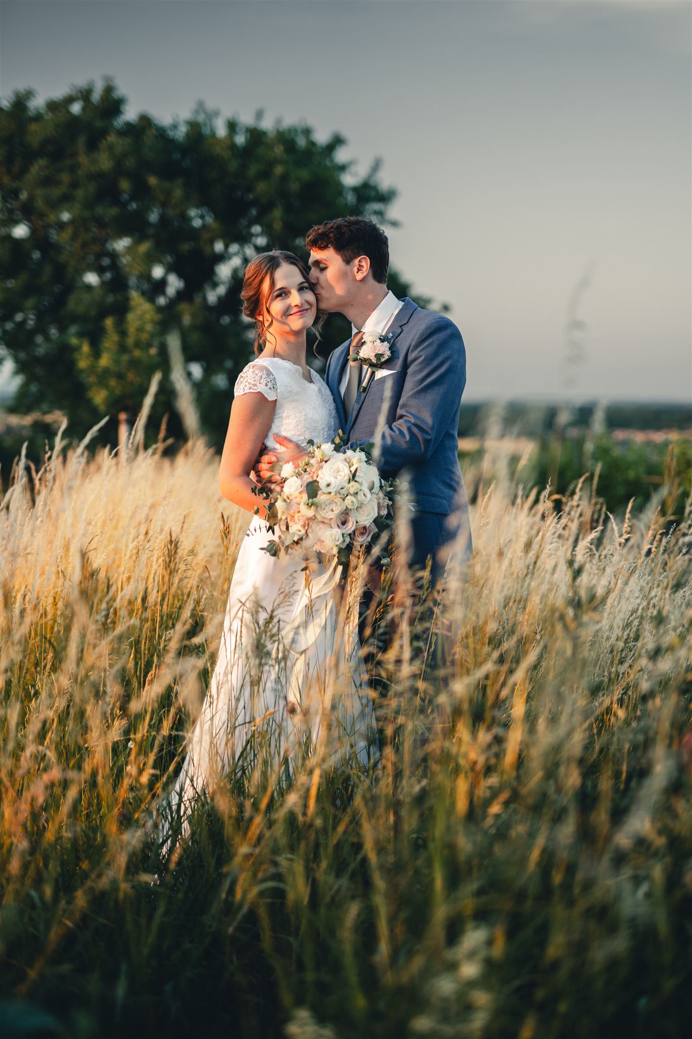 Zatímco při odpoledním focením je to vyloženě o hledání hezkých zákoutí a stínů, při večerním focení se dá naplno využít krásné teplé světlo. K takovým fotkám často stačí na 10 minut vyběhnout na louku za místem oslavy, takže si vaší absence nikdo ani nevšimne.